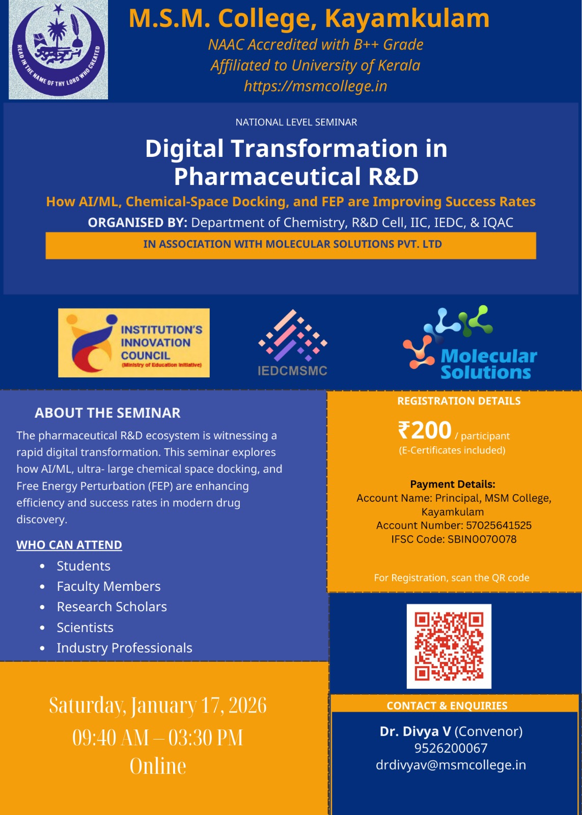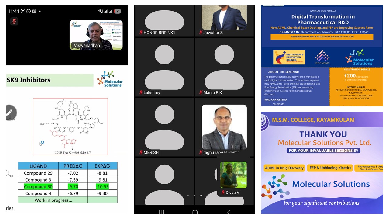 M.S.M. College, Kayamkulam, successfully organized a one-day National Level Seminar on “Digital Transformation in Pharmaceutical R&D: How AI/ML, Chemical-Space Docking, and FEP are Improving Success Rates” on Saturday, 17 January 2026, in online mode. The seminar was organized by the Department of Chemistry in association with the R&D Cell, Institution’s Innovation Council (IIC), IEDC, and IQAC, in collaboration with Molecular Solutions Pvt. Ltd. The programme was conducted under the patronage of Haji P. A. Hilal Babu, Manager-cum-Secretary, MSM Trust of Institutions.