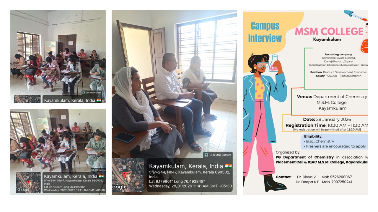 The PG Department of Chemistry, M.S.M. College, Kayamkulam, in association with the Placement Cell and IQAC, successfully organized a campus interview programme on 28 January 2026 at the Department of Chemistry, M.S.M. College, Kayamkulam. This programme marks the first-ever campus placement initiative conducted at M.S.M. College specifically for Chemistry students, representing a significant milestone in the institution’s placement activities.
