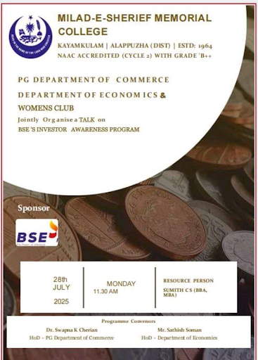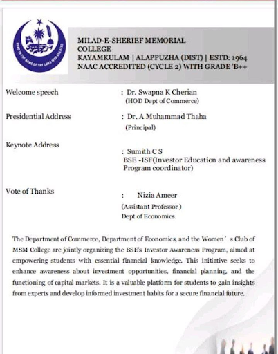 The session was formally inaugurated with the presidential address by Dr. A Muhammad Thaha, Principal of MSM College. The resource person for the session was Mr. Sumith C S, a seasoned expert in capital markets and investor education. He delivered an insightful presentation on the basics of stock markets, the importance of saving and investing early, risk management, and how to make informed investment decisions. The session was highly interactive, with students actively engaging in discussions and clarifying their doubts.