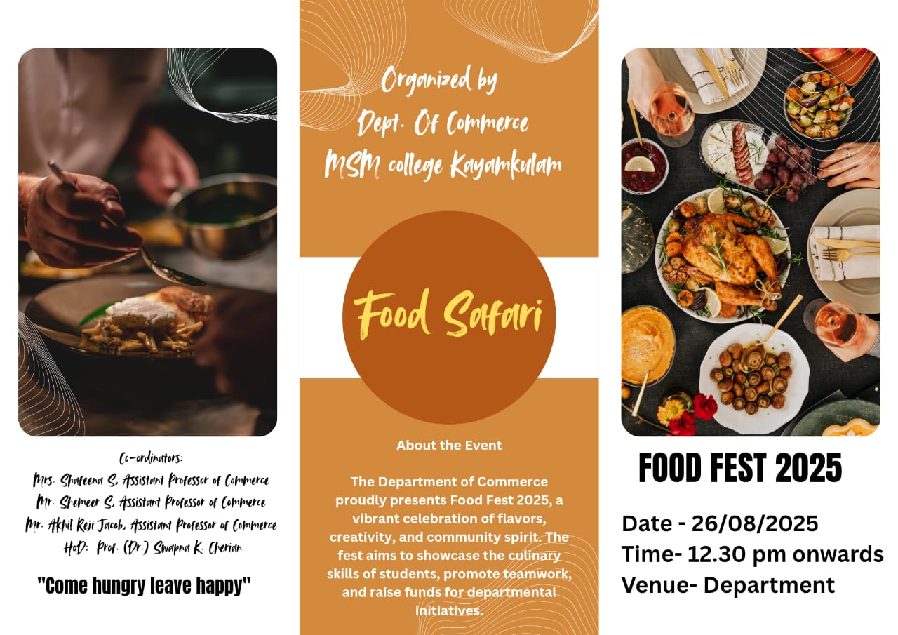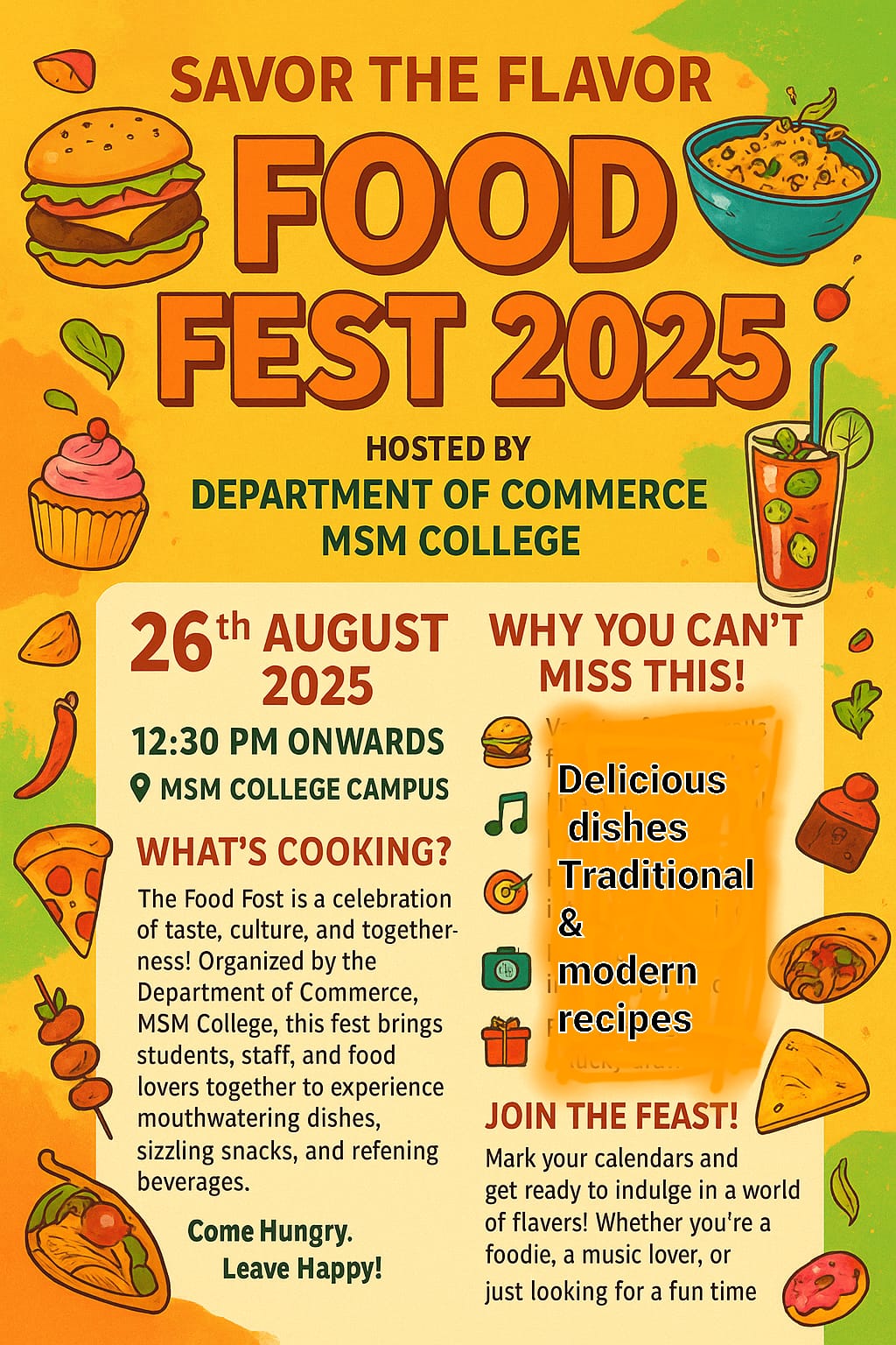 The Department of Commerce of MSM College organized a vibrant Food Fest – Food Safari on 26th August 2025 at 12:30 pm. The event was officially inaugurated by our respected Principal Dr. Muhammad Thaha, who appreciated the initiative of the department in fostering creativity, teamwork, and entrepreneurial spirit among students.