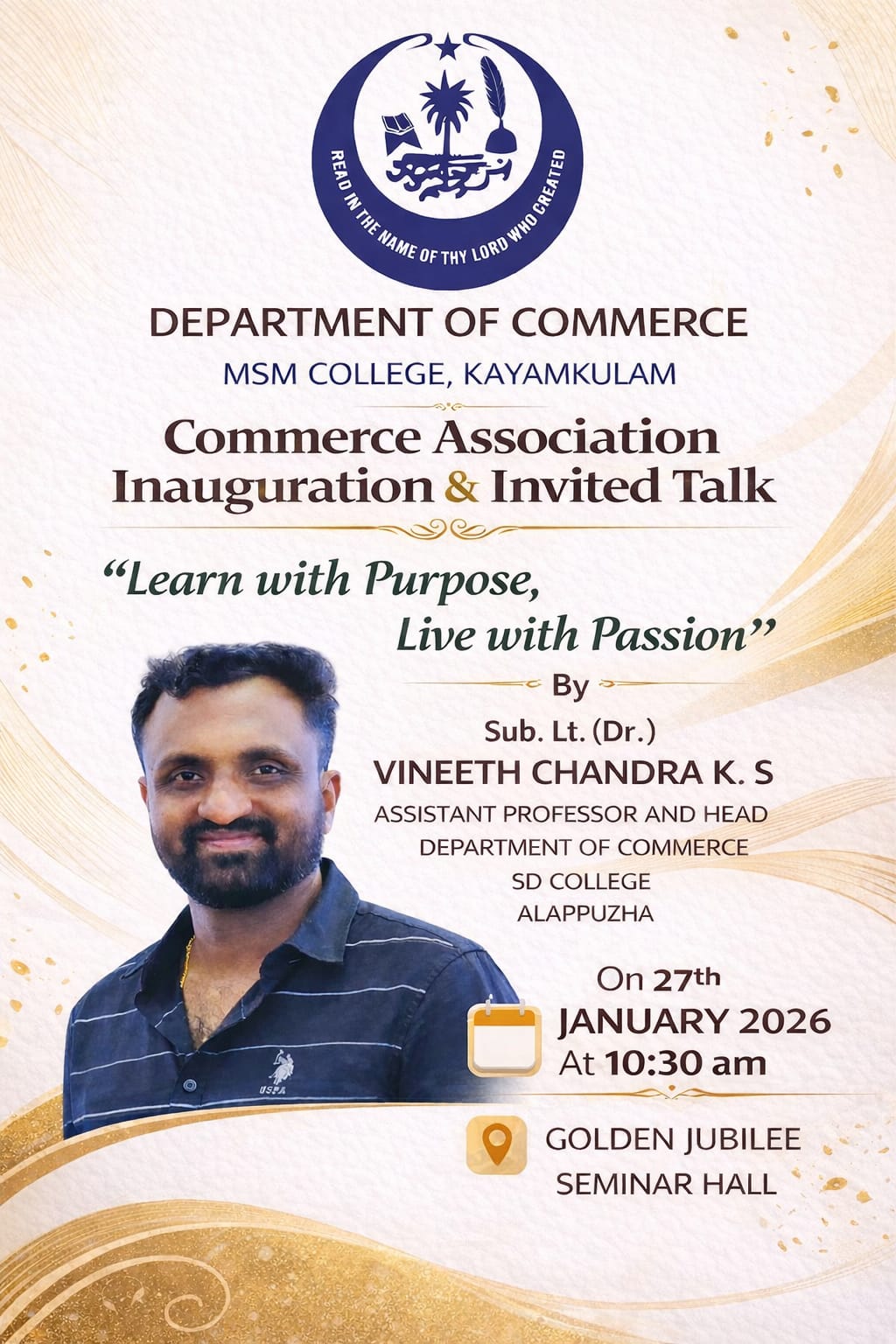 The Department of Commerce, Milad-e-Sherief Memorial College, Kayamkulam, organized the Commerce Association Inauguration and Invited Talk (FINOVA) on 27 January 2026 at 10:30 a.m. in the Golden Jubilee Seminar Hall.