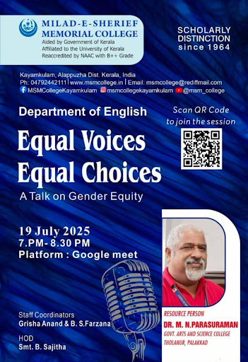 GENDER EQUITY, DEFINED BY THE EUROPEAN INSTITUTE FOR GENDER EQUALITY, IS THE “PROVISION OF FAIRNESS AND JUSTICE IN THE DISTRIBUTION OF BENEFITS AND RESPONSIBILITIES BETWEEN WOMEN, MEN AND ALL GENDERS.” GENDER EQUITY IS VITAL BECAUSE, HISTORICALLY, SOCIETIES AROUND THE WORLD HAVE DEEMED FEMALES, TRANSGENDER PEOPLE, AND NONBINARY PEOPLE AS “WEAKER” OR LESS IMPORTANT THAN MALES. ELIMINATING ALL DISCRIMINATION ON THE BASIS OF GENDER IS A BASIC HUMAN RIGHT. IT IS ALSO IMPORTANT FOR MENTAL DEVELOPMENT, ECONOMIC GROWTH AND SUSTAINABLE FUTURE. SO, TO GIVE THE STUDENTS A UNIQUE PERSPECTIVE ON THE WORLD AND HELP THEM UNDERSTAND HOW GENDER SHAPES THEIR LIVES AND THE LIVES OF OTHERS, DEPARTMENT OF ENGLISH ORGANIZED A GENDER SENSITIZATION PROGRAMME TITLED “EQUAL VOICES, EQUAL CHOICES” ON 19TH JULY 2025. AN COMPREHENSIVE AND INFORMATIVE TALK BY THE RESOURCE PERSON DR. M.N. PARASURAMAN THREW LIGHT ON THE SOCIETAL ATTITUDE TOWARDS GENDER EQUITY IN INDIA IN PARTICULAR AND GENDER EQUALITY IN GENERAL. HE HIGHLIGHTED THE MAJOR CHALLENGES IN THE STREET AHEAD AND SUGGESTED THE CORRECTIVE MEASURES TO OVERCOME THOSE. THE TALK HAS BEEN COORDINATED BY GRISHA ANAND AND B.S. FARZANA. OUR STUDENTS BELONGING TO FIRST, SECOND AND THIRD YEAR OF B.A LITERATURE AND COMMUNICATIVE ENGLISH AND P.G CLASSES BENEFITTED FROM THE SESSION. THE SESSION WAS INSPIRING FOR THE STUDENTS AND IT ENDED WITH AN INTERACTIVE SESSION BETWEEN THE RESOURCE PERSON AND THE STUDENTS AND FACULTY PRESENT FOR THE SESSION.