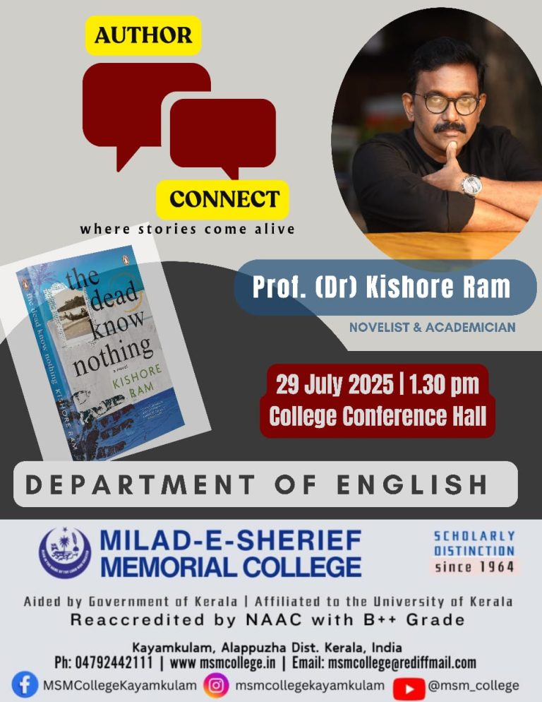 On 29th July 2025, the Department of English at M.S.M. College, Kayamkulam hosted an enlightening session titled “Author Connect” in the College Conference Hall. The event featured an interactive talk with Prof. (Dr.) Kishore Ram, renowned novelist and academician, who discussed his debut novel Dead Know Nothing with students and faculty. Dr. Kishore Ram shared valuable insights into his journey as a writer, detailing the creative process behind his novel as well as his experiences navigating the publishing world. The session was highly engaging, with several students actively participating by posing questions about the themes of the book and the challenges of writing and publishing.