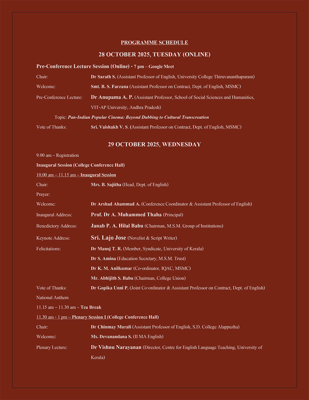 - National Seminar on Themes and Theories in Contemporary Literature in English held at M.S.M College, Kayamkulam. (UGC, June 2013).