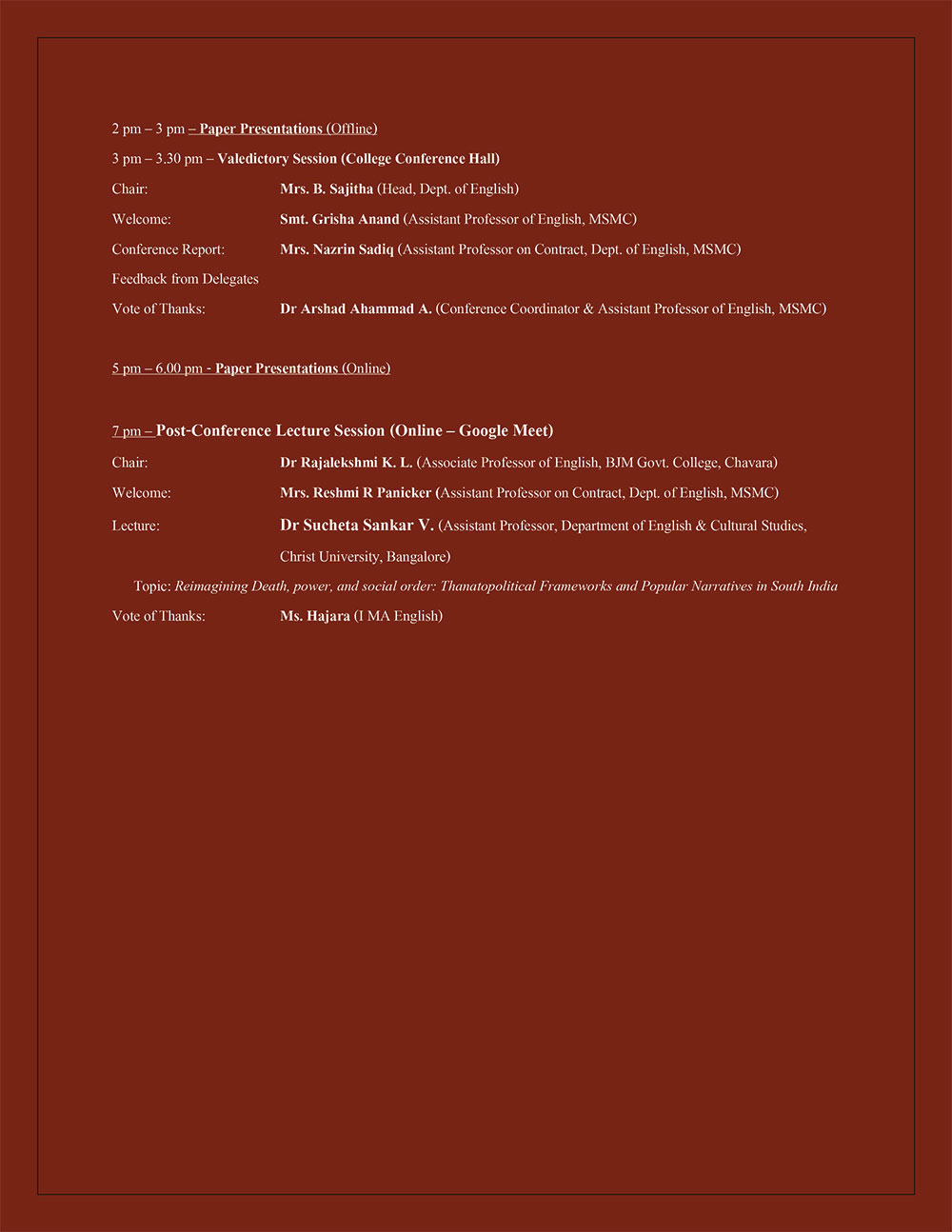 - National Seminar on TRAVAILS OF UPROOTMENT: A TRIBUTE TO REFUGEES, EXILES AND DIASPORIC COMMUNITIES – July 2015 – M.S.M. College, Kayamkulam. Sponsored by UGC