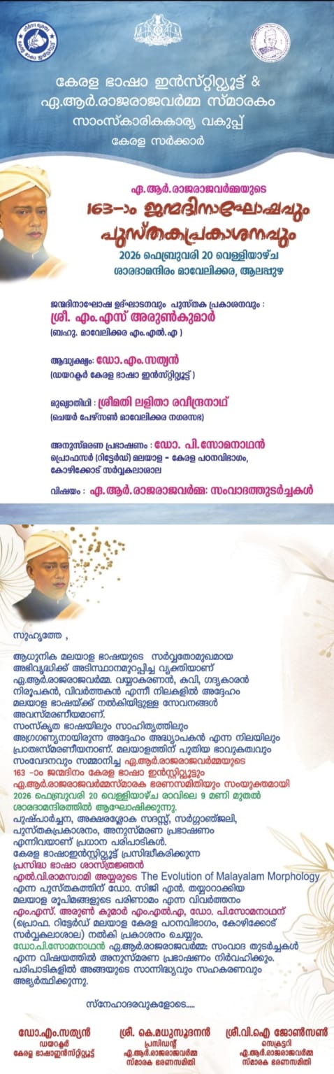 മലയാളഭാഷയുടെ അഭിവൃദ്ധിക്ക് അടിസ്ഥാനമുറപ്പിച്ച ഏ.ആർ.രാജരാജ വർമ്മയുടെ 163 ആം ജന്മദിനത്തോടനുബന്ധിച്ച് കായംകുളം എം.എസ്. എം കോളേജ് മലയാള വിഭാഗം വിദ്യാർത്ഥികൾ 20/02/2026 നു ഏ.ആർ സ്മാരകമായ ശാരദാമന്ദിരം സന്ദർശിച്ചു.