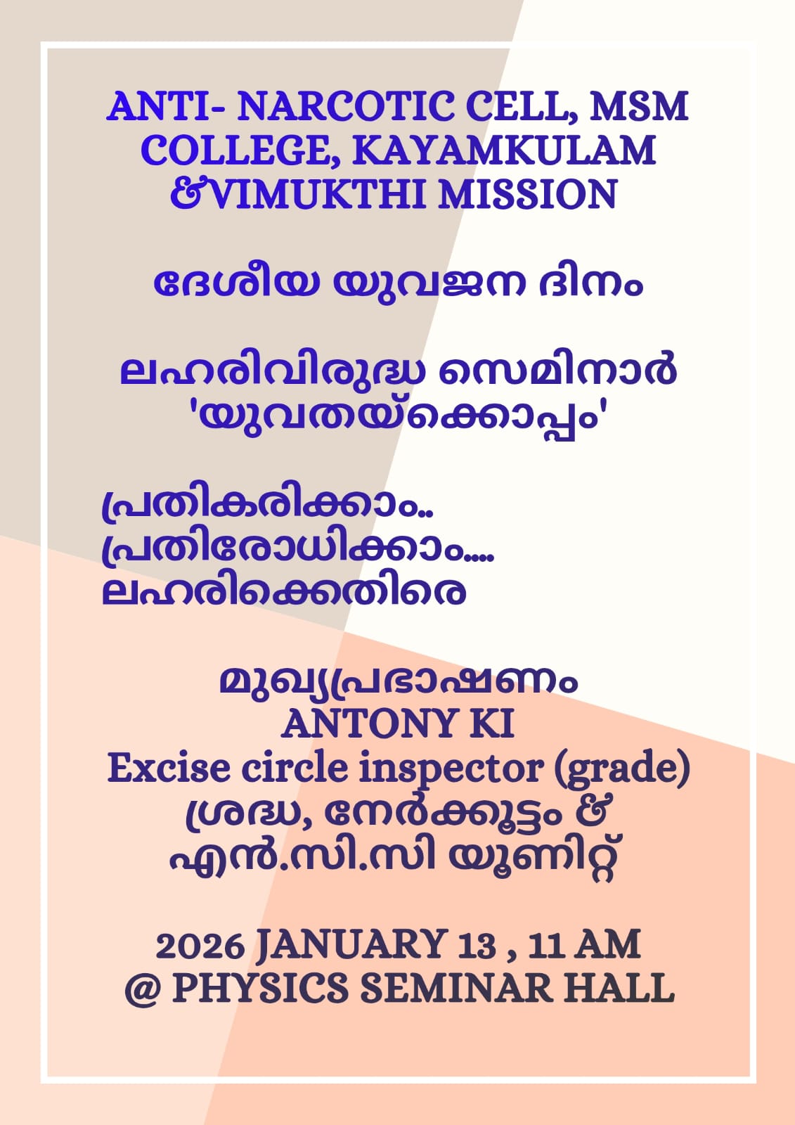 The Anti-Narcotic Cell of MSM College, Kayamkulam, organized an Anti-Narcotic Seminar in association with the Vimukthi Mission of the Department of Excise on 13 January 2026, as part of the National Youth Day celebrations. The programme was held at the Physics Seminar Hall from 11.00 a.m. to 1.00 p.m.