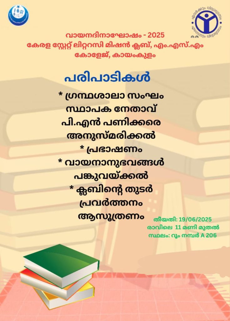 National Reading Day was celebrated at M.S.M College , Kayamkulam under the auspices of the Literacy Mission Club. The event aimed to instill reading habits and a sense of humanity in students by highlighting the importance of reading and the relevance of their mother tongue.Mrs. Latha V, Assistant Professor of malayalam and college-level coordinator of the Kerala State Literacy Mission Club, presided over the function.