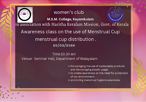 An awareness class on the use of menstrual cups was organized by the Women’s Club in association with the Haritha Keralam Mission – a comprehensive, participatory development initiative launched by the Kerala Government to create a “Green Kerala” on 20/02/2026 at 10.30 am at the Seminar Hall, Department of Malayalam.