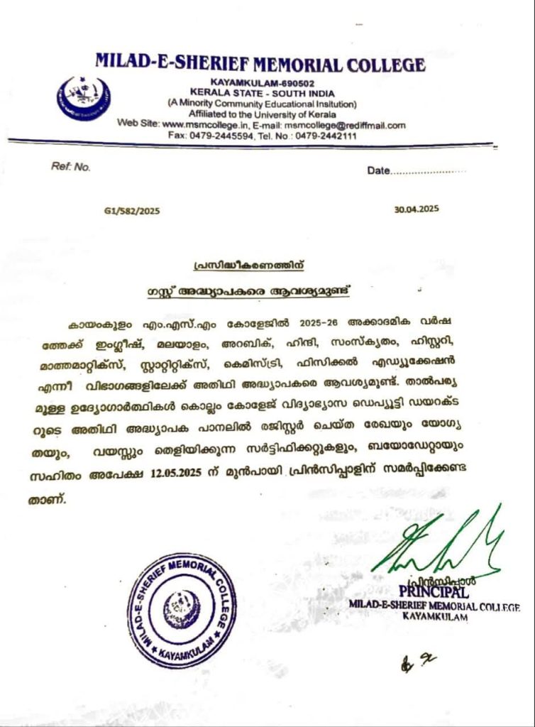 Guest Lecturers Vacancy at MSM College Kayamkulam. Subjects: English, Arabic, Malayalam, Hindi, History, Mathematics, Statistics, Chemistry, Sanskrit and Physical Education. Last Date of application: 12/05/2025.