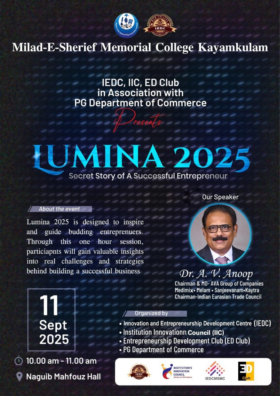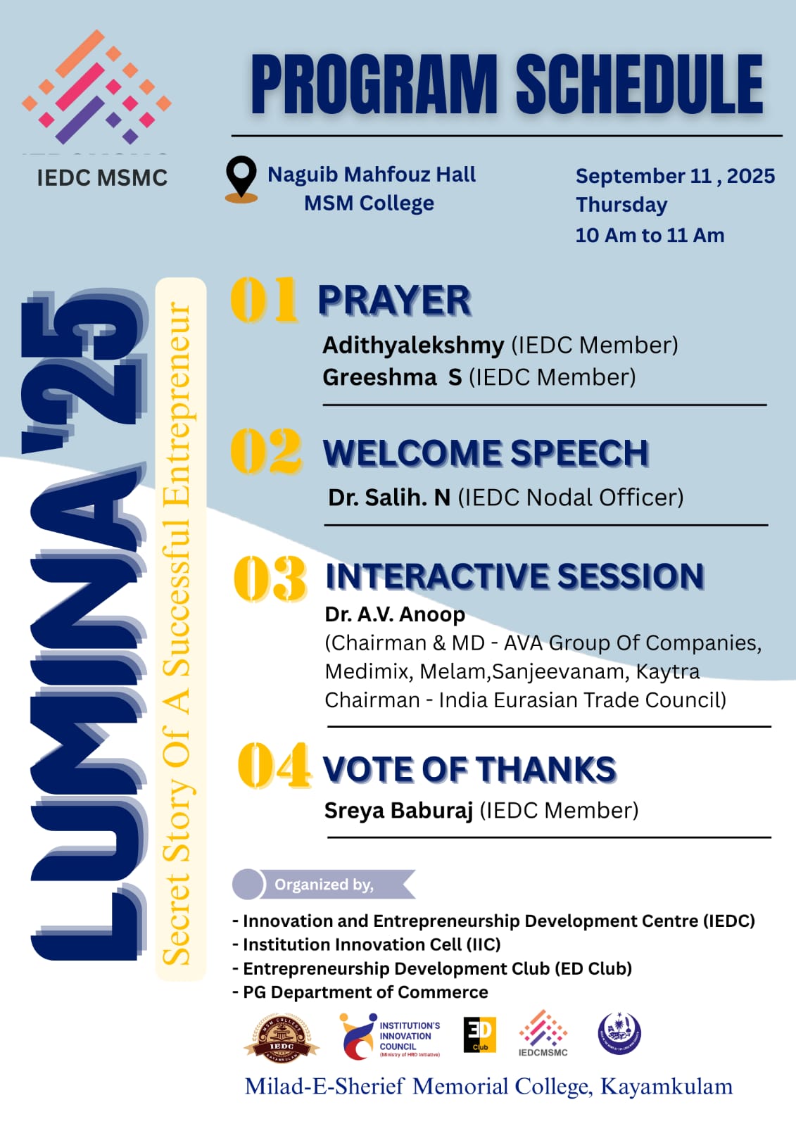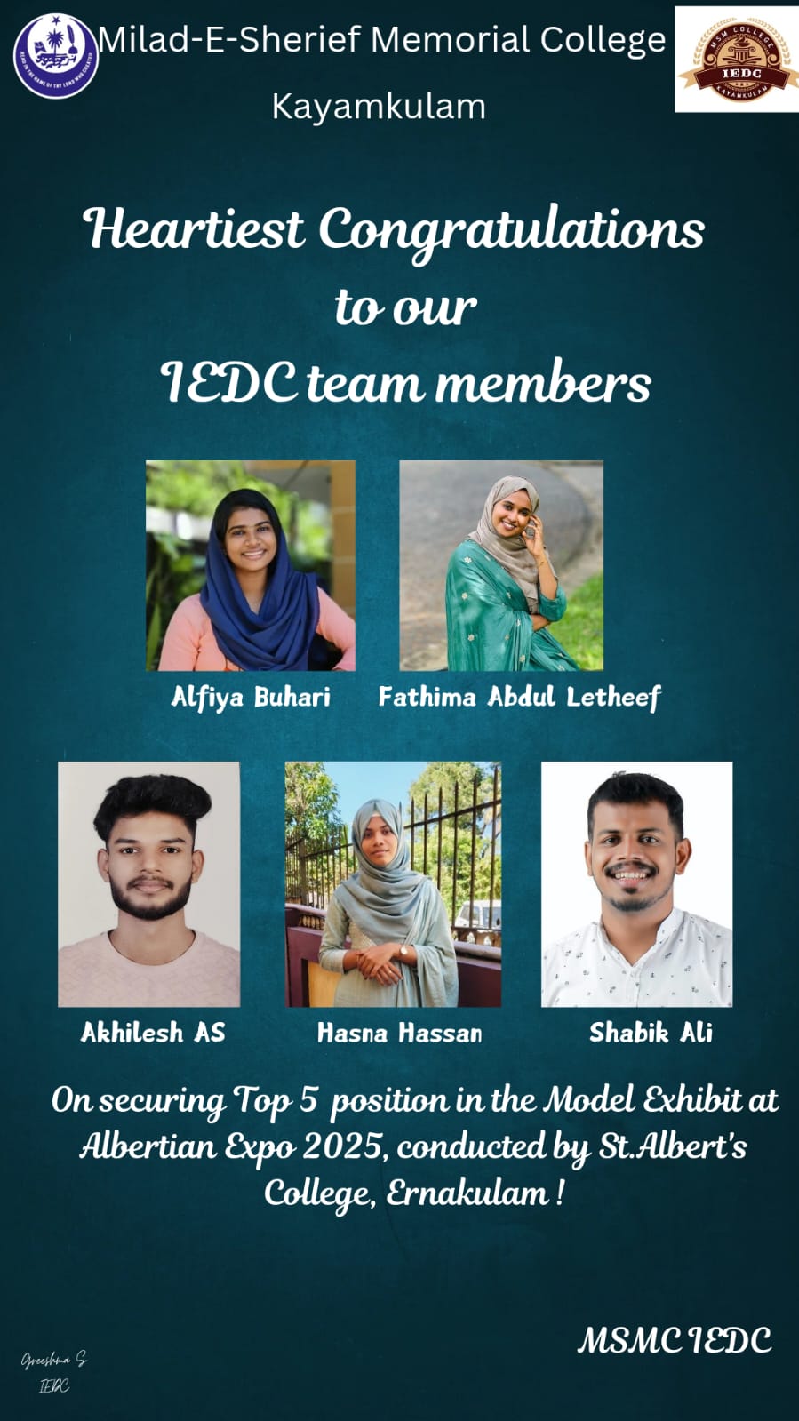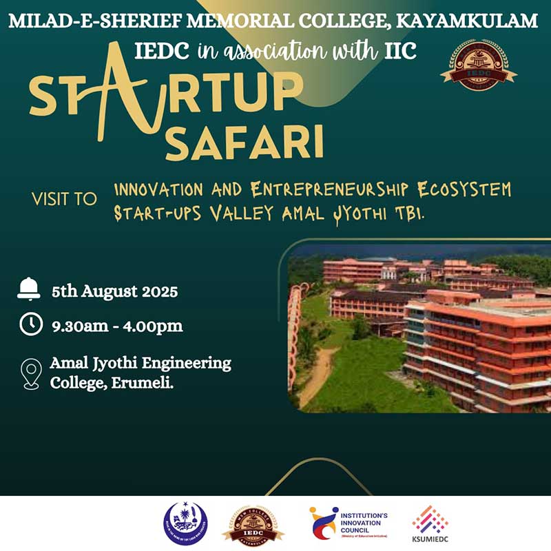 We are pleased to announce that Shabik Ali, Student Main Lead of MSM COLLEGE IEDC, has been selected for the Guest & Speakers Management team at the Founder’s Summit program of the Kerala Innovation Festival 2025, India’s largest innovation festival, where Infosys Company CEO Kris Gopalakrishnan will be the Chief Guest. Congratulations to Shabik Ali and the MSMC IEDC Team 💐.