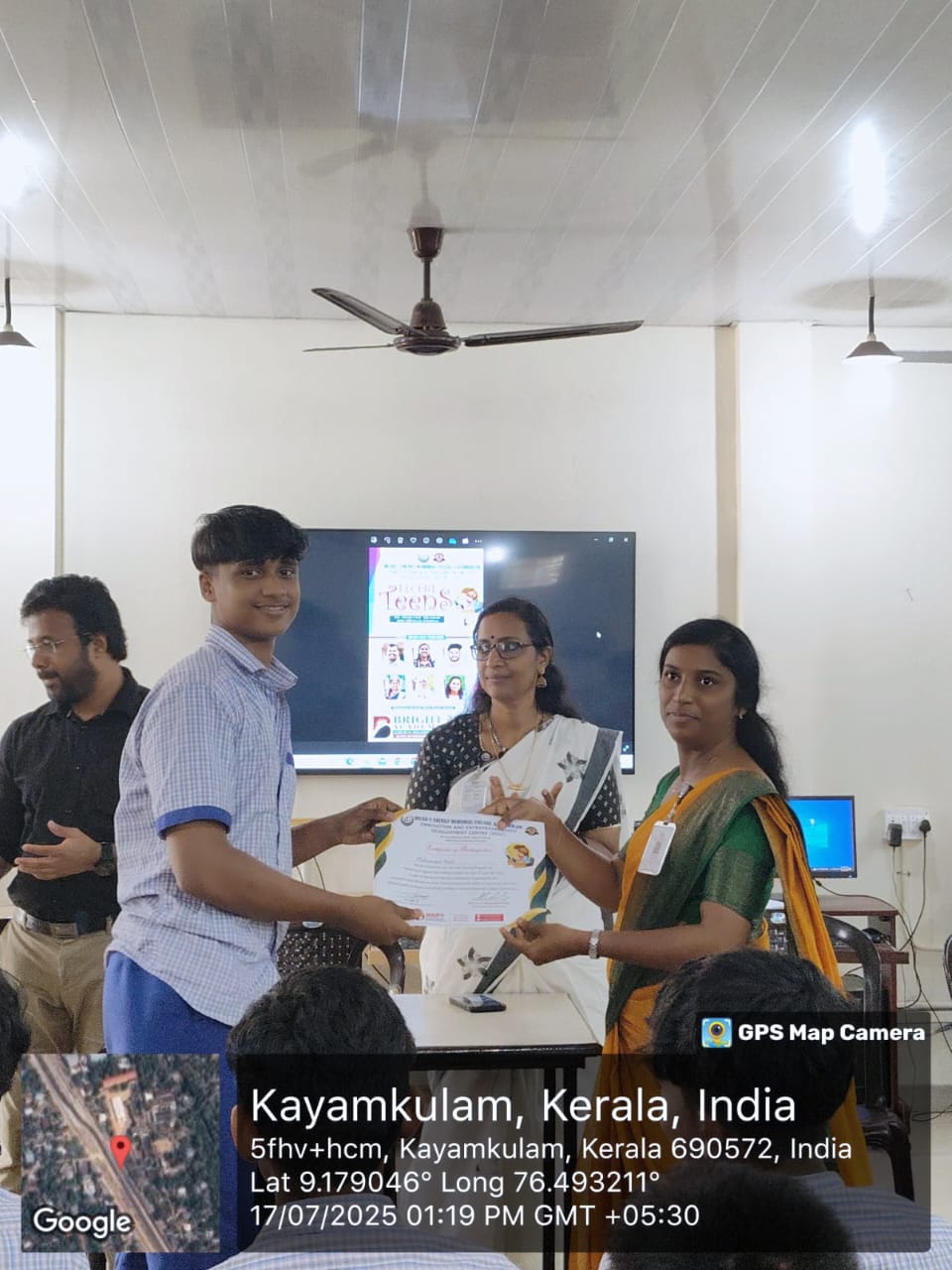 Fatima Abdul Latheef, a key member of our IEDC team, recently showcased her exceptional public speaking skills at an elocution competition organized by the Ernakulam District Collectorate as part of LEAP Kerala. She passionately spoke on the topic “Why youth should vote: indifference to involvement,” inspiring fellow participants and attendees alike. We congratulate Fatima on her outstanding performance and are thrilled to share that she received a certificate of appreciation from none other than Ernakulam District Collector, Smt. Priyanka G IAS, recognizing her efforts in promoting civic engagement among youth.