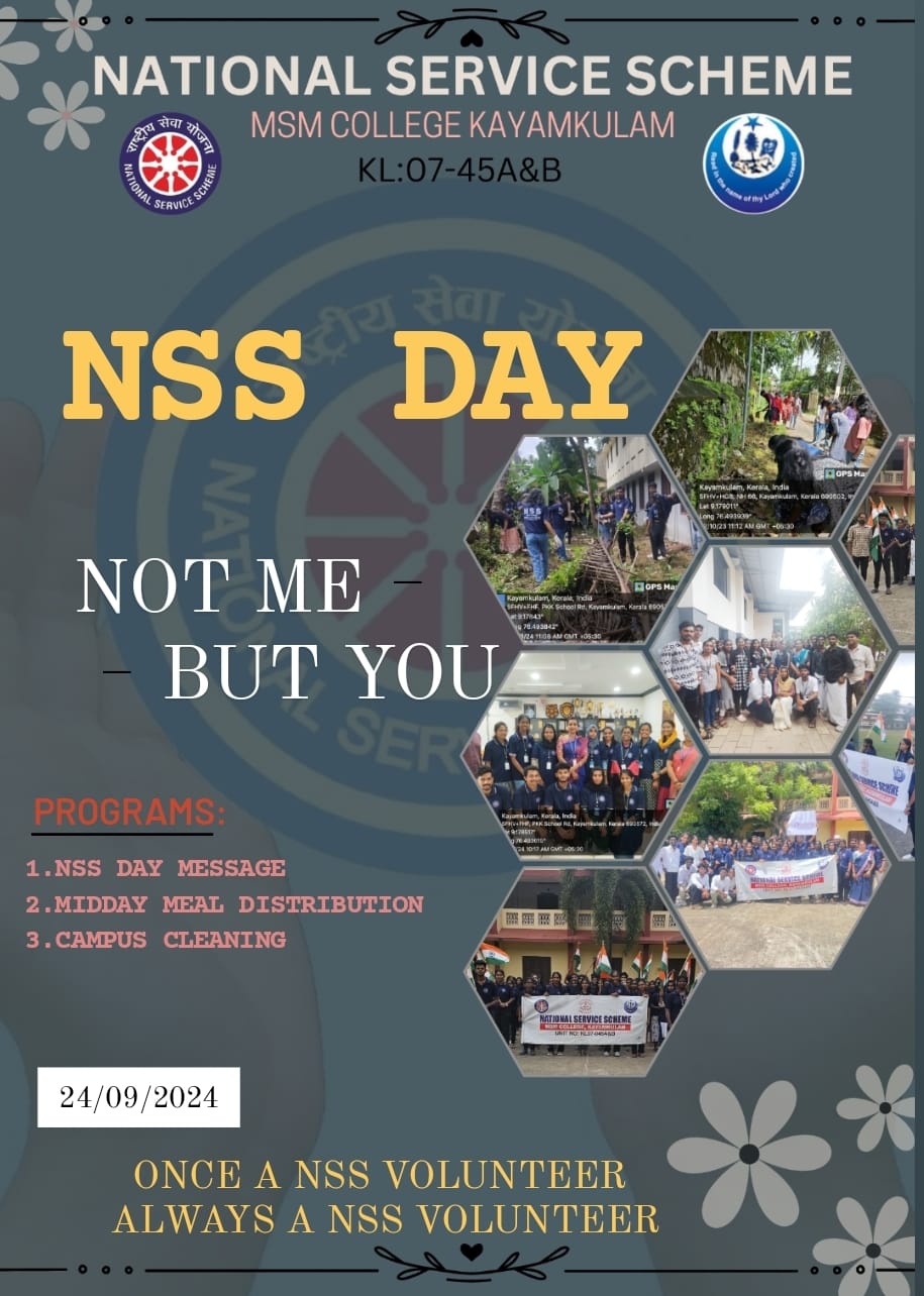 The National Service Scheme has been functioning with the motto “NOT ME BUT YOU” in view of making the youth inspired in service of the people and hence NSS aims at the volunteers’ Personality Development through Community Service