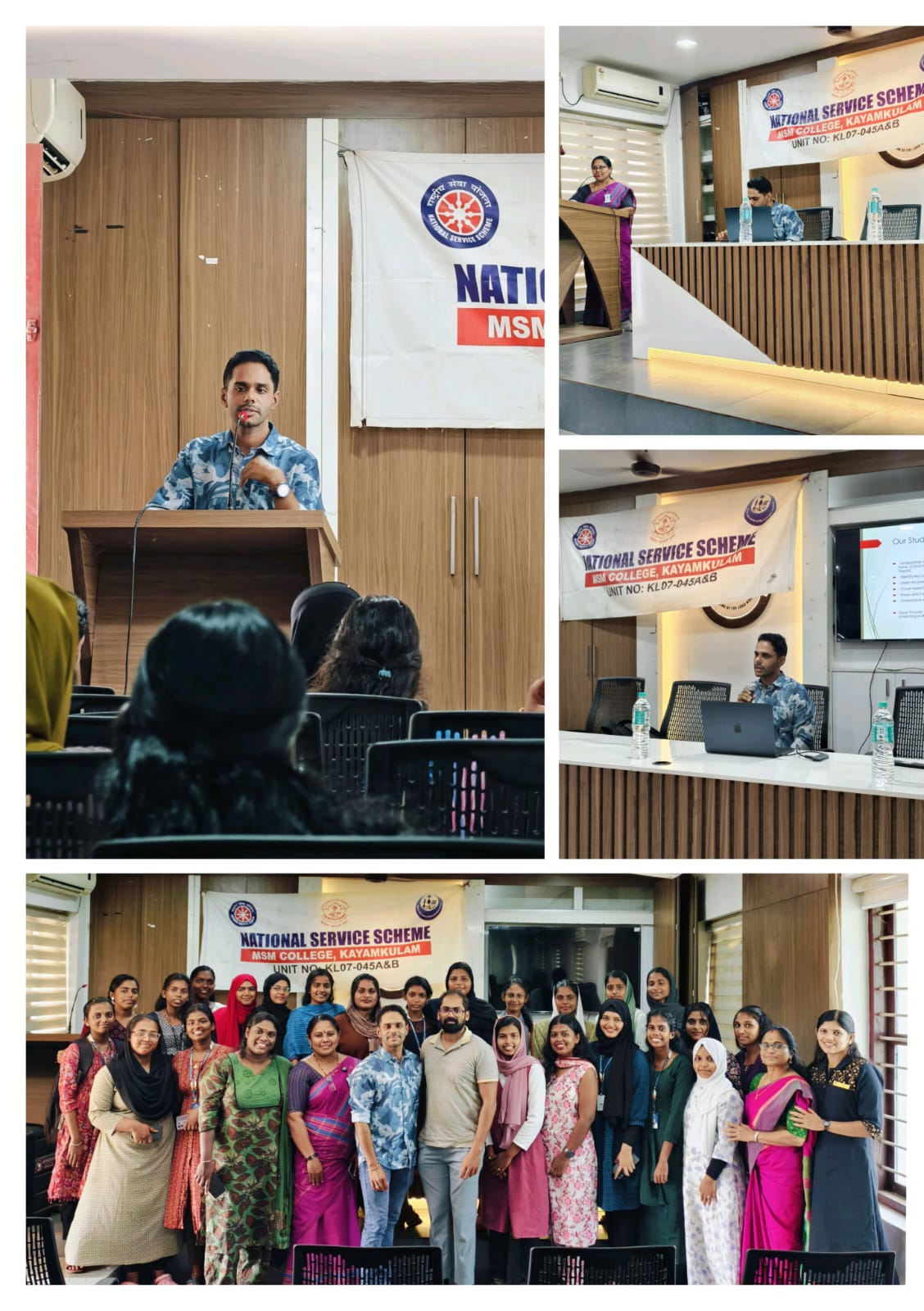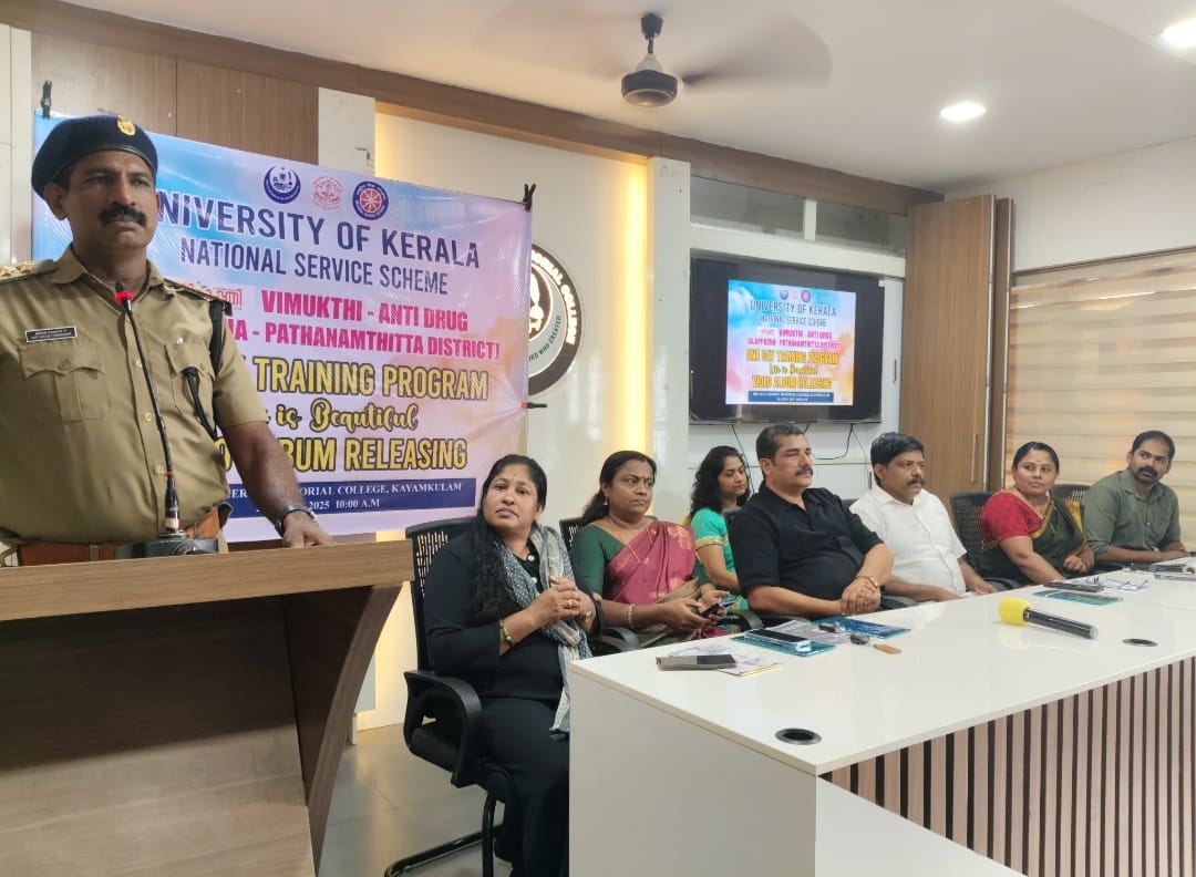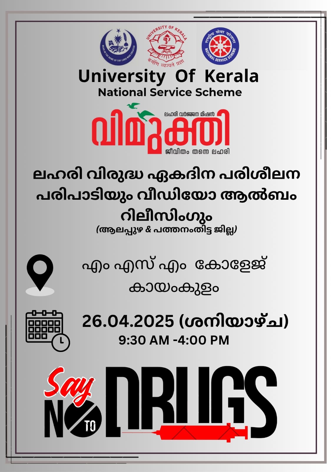 The National Service Scheme (NSS) of the University of Kerala organized a one-day anti-drug training program, Vimukthi, for the Alappuzha and Pathanamthitta districts on Saturday, 26th April 2025, at MSM College, Kayamkulam. The event, coordinated by the college’s NSS Unit, commenced at 10:30 AM. The program was inaugurated under the esteemed presidency of Prof. (Dr.) A. Mohammed Thaha, Principal of MSM College. Mr. Anwar Sadath, Assistant Excise Commissioner of Kasaragod, graced the occasion as the chief guest. During the inauguration, Mr. Sadath also released a video album produced by the NSS unit of the college. Ms. Preetha M. V., District Coordinator for Alappuzha and Pathanamthitta, extended the welcome address. Dr. Manoj T. R., Syndicate Member of Kerala University, delivered the keynote address. Dr. Lakshmi S., NSS Program Officer of S.D. College, Alappuzha, conveyed felicitations. The college principal and other contributors to the video album project were honored during the ceremony. The inaugural session concluded with a vote of thanks proposed by Dr. Sreeja R., Program Officer of the MSM College NSS Unit. The training program continued throughout the day with three focused sessions. Classes on various aspects of drug eradication were conducted by Mr. Eby. M. S., Sub-Inspector of Kurathikad; Mr. Girish Kumar, Circle Inspector of Haripad; and Ms. Sunitha C. S., Counseling Psychologist, Psychotherapist, and Hypnotist. A total of 46 selected NSS volunteers from various units in Alappuzha and Pathanamthitta participated in the training program. The one-day event concluded with a vote of thanks delivered by Mr. Jijo C. Varghese, NSS Program Officer of MSM College.