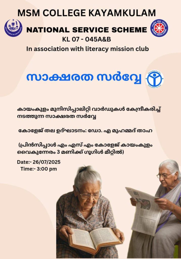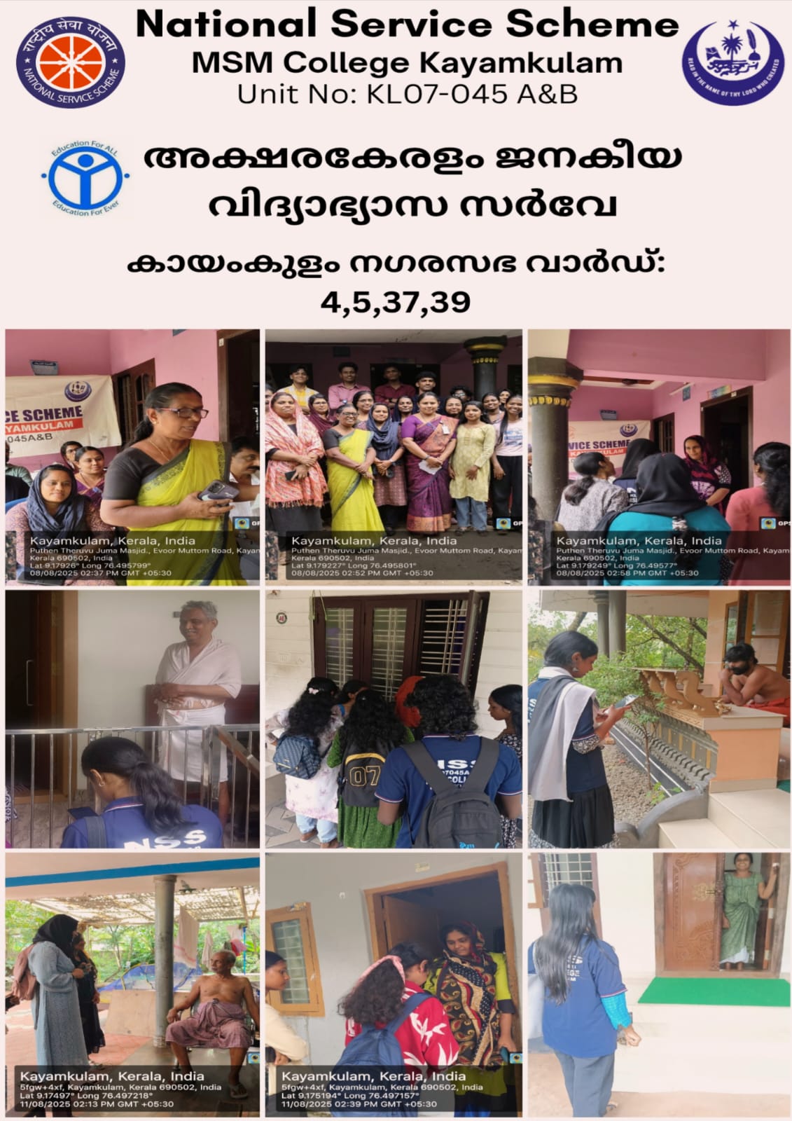 The NSS Unit of MSM College, Kayamkulam, successfully conducted an educational survey under the Akshara Keralam programme. The survey was carried out in 439 households across wards 4, 5, 37, and 39 of the Kayamkulam Municipality.