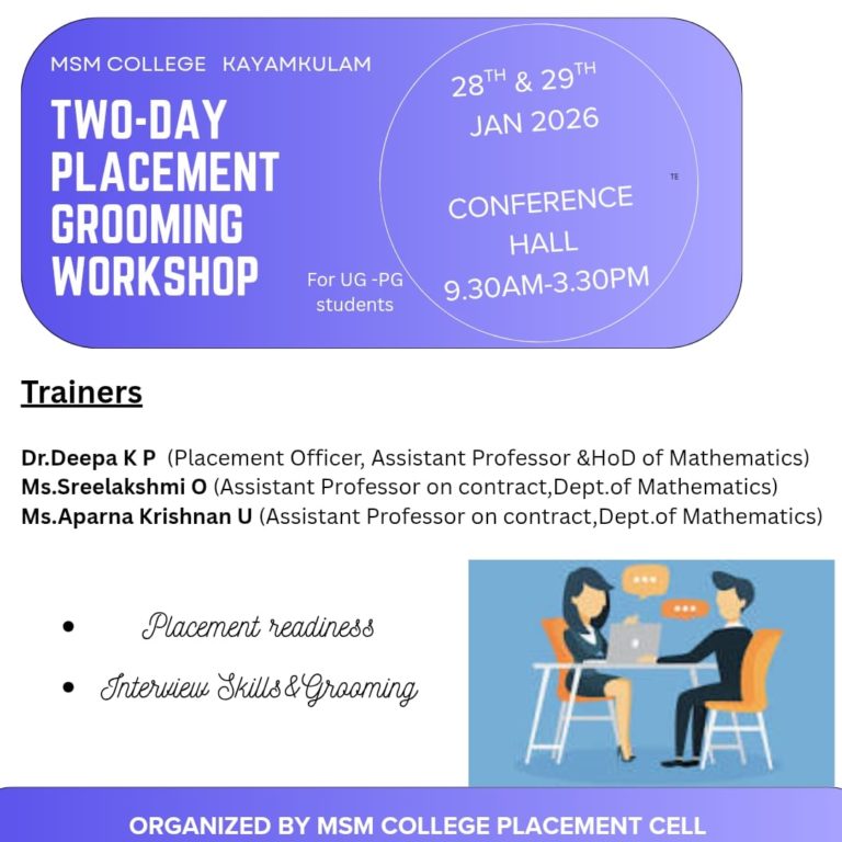 A Two-Day Placement Grooming Workshop was successfully conducted by the Placement Cell of MSM College, Kayamkulam on 28th and 29th January at the College Conference Hall. The programme was organised with the objective of preparing students for campus placements and enhancing their employability skills.