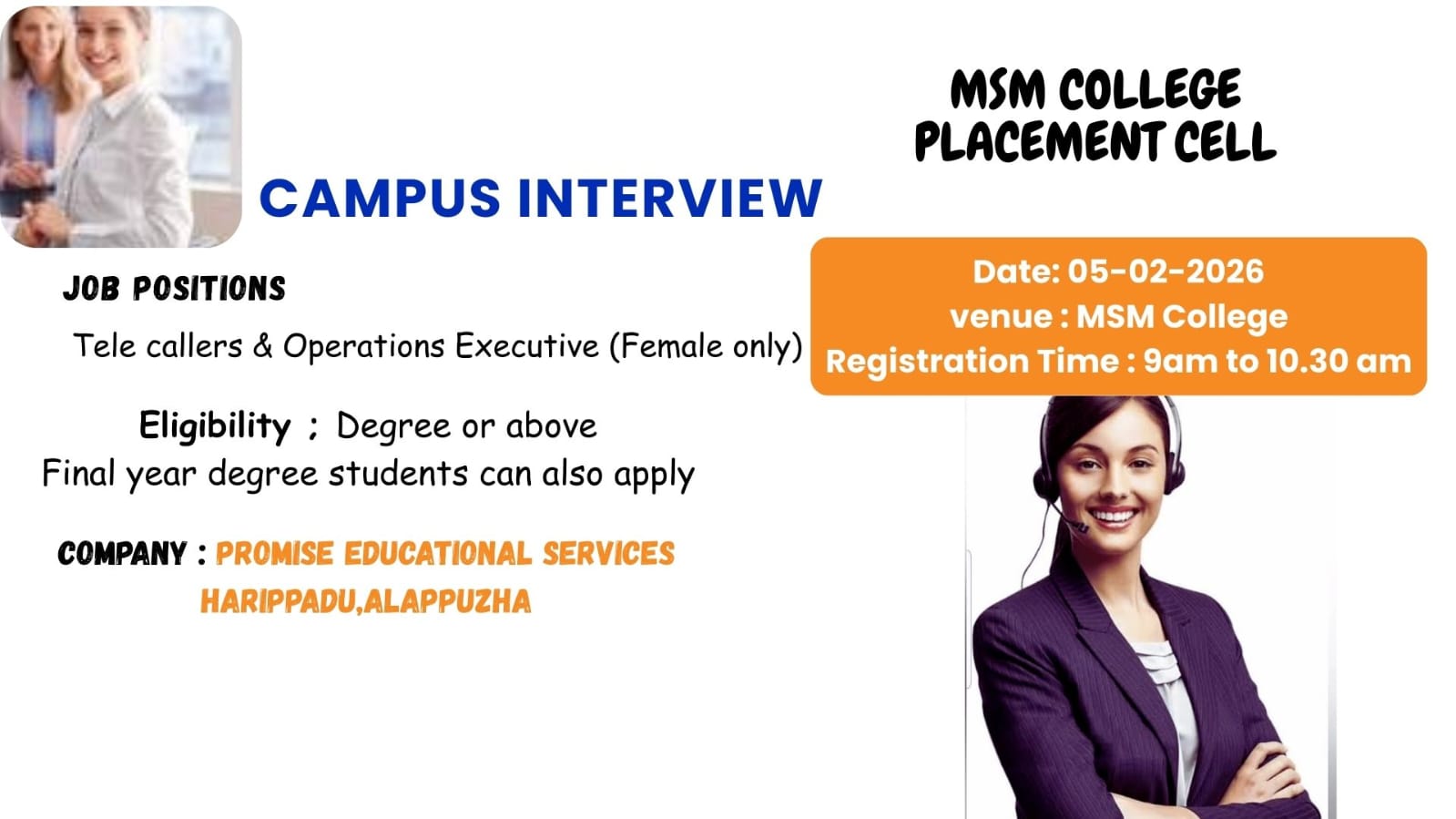 A campus recruitment drive was organized by the Placement Cell of M.S.M. College, Kayamkulam on 05 February 2026 at the college campus. The recruitment was conducted in association with Promise Educational Service, Alappuzha, for the positions of Tele caller and Operations Executive. The drive was conducted exclusively for female candidates with a minimum qualification of Degree or above.