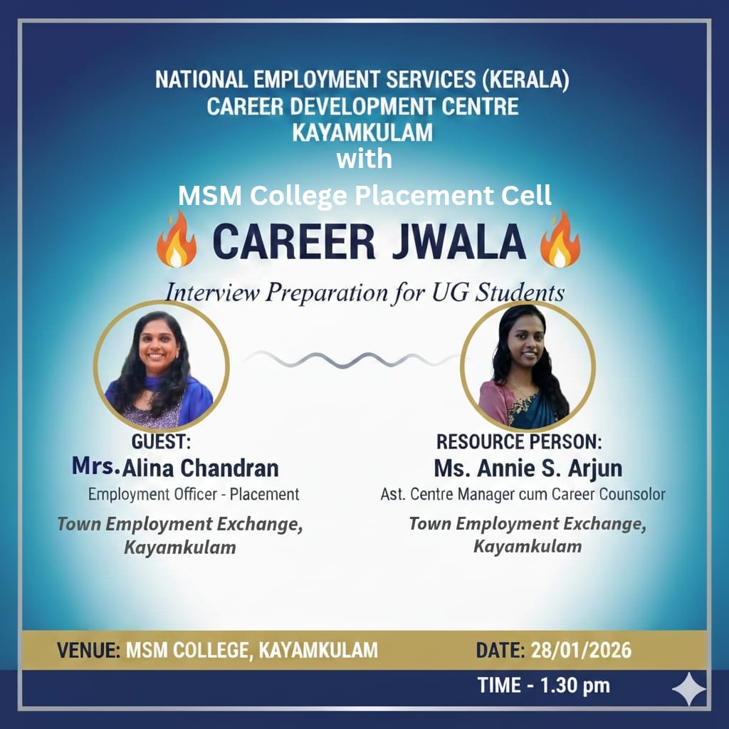 The Employment Exchange, in association with the Placement Cell, MSM College, Kayamkulam organized a seminar titled “Career Jwala” on interview preparation for undergraduate students. The programme aimed at equipping students with essential interview skills and preparing them for future career opportunities.