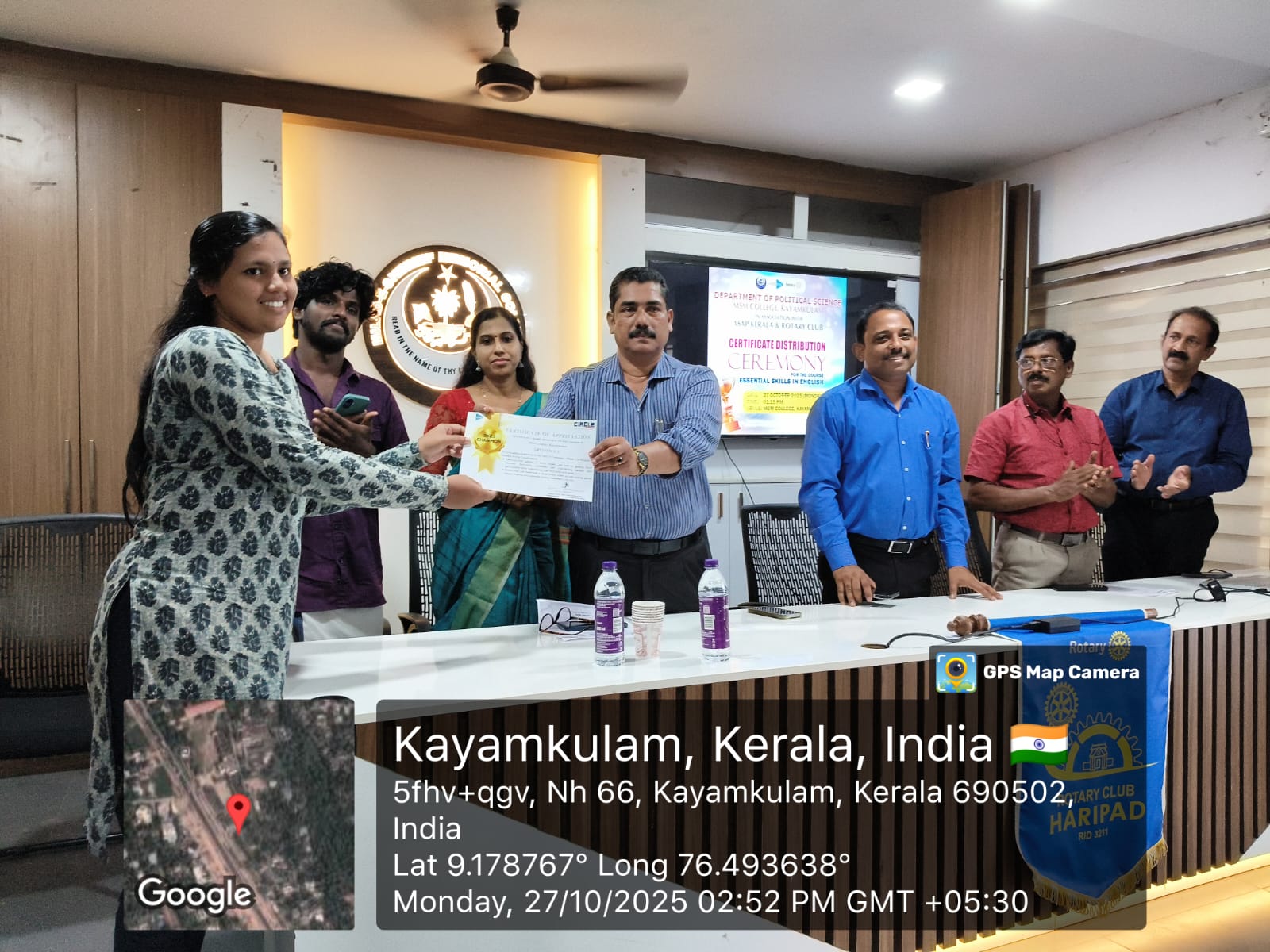 Josmi Jose won Ist rank ( 2013) for B.A Political Science Examination, University of Kerala. - Afeeha Muhammed Ali (2019-2021 batch) attended and a won verbal commendation award in the Asia Youth International Model United Nations Virtual Conference ” Accelerate Social Stability Amongst Sovereign Nations ” (28th -31st) May, 2021.